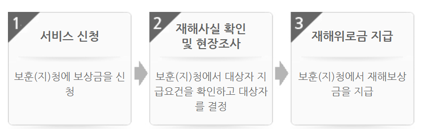 - 인명피해의 경우 사망(실종)은 500만원, 2주 이상 입원치료가 필요한 부상은 30만원 지급